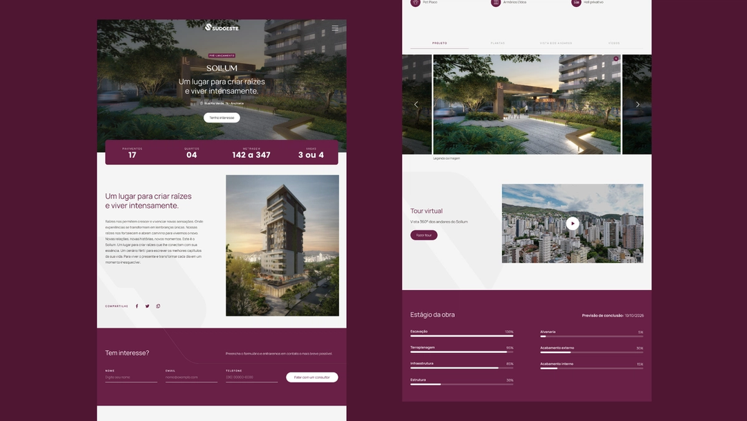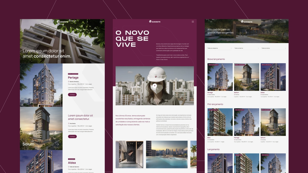 Sudoeste is an established construction company with over 30 years of experience in the Belo Horizonte-MG market. Its principle is to design and deliver projects with a focus on enhancing well-being, incorporating finishes that blend sophistication with the quality of life it offers to its clients. The construction company already had a previous website that did not align with the current moment, and they approached us with the goal of updating the site to provide a better experience for their users who want to explore their developments, track the status of construction projects, get in touch, and primarily, make purchases.
